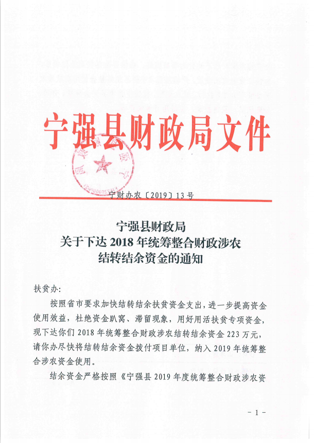關(guān)于下達(dá)2018年統(tǒng)籌整合財(cái)政涉農(nóng)結(jié)轉(zhuǎn)結(jié)余資金的通知