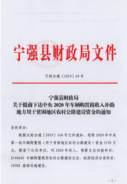 關于提前下達中央2020年車輛購置稅收入補助地方用于貧困地區農村公路建設資金的通知