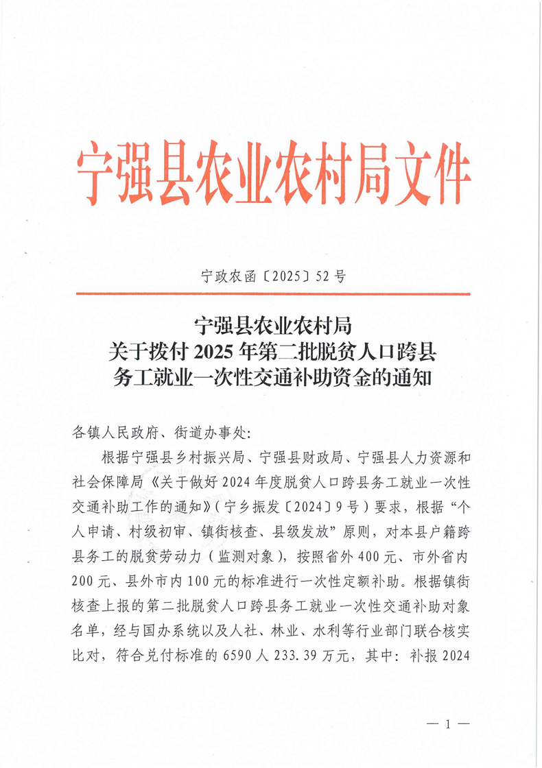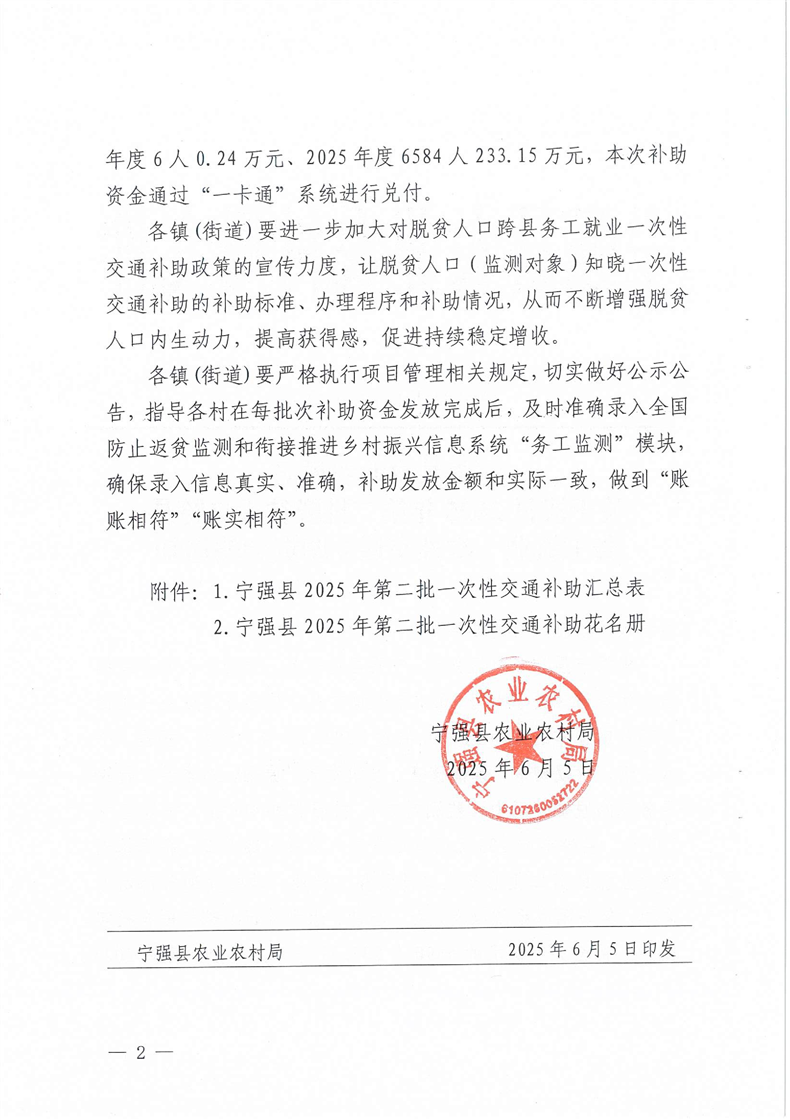 關于撥付2025年第二批脫貧人口跨縣務工就業一次性交通補助的通知