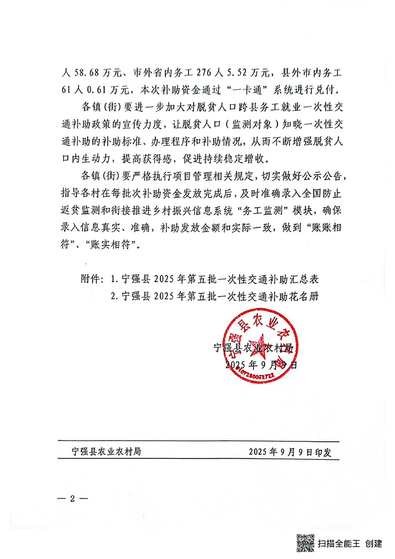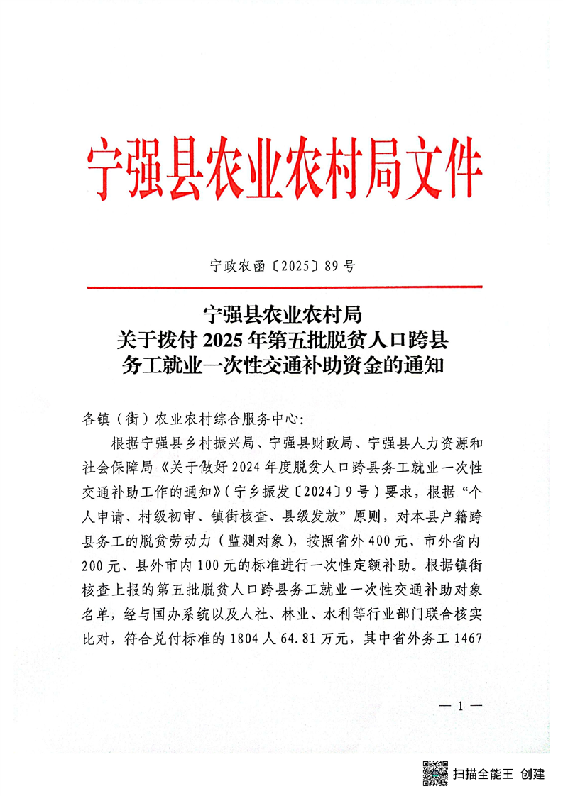 寧強縣農業農村局關于撥付2025年第五批脫貧人口跨縣務工就業一次性交通補助資金的通知