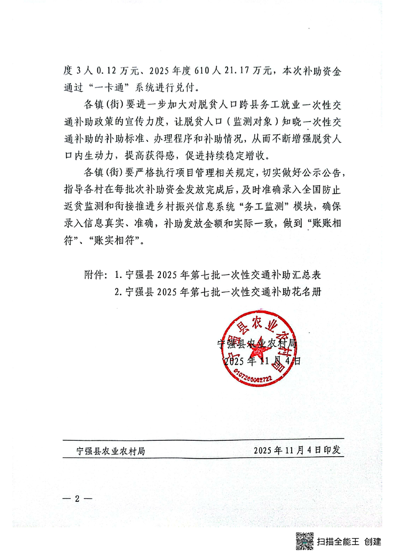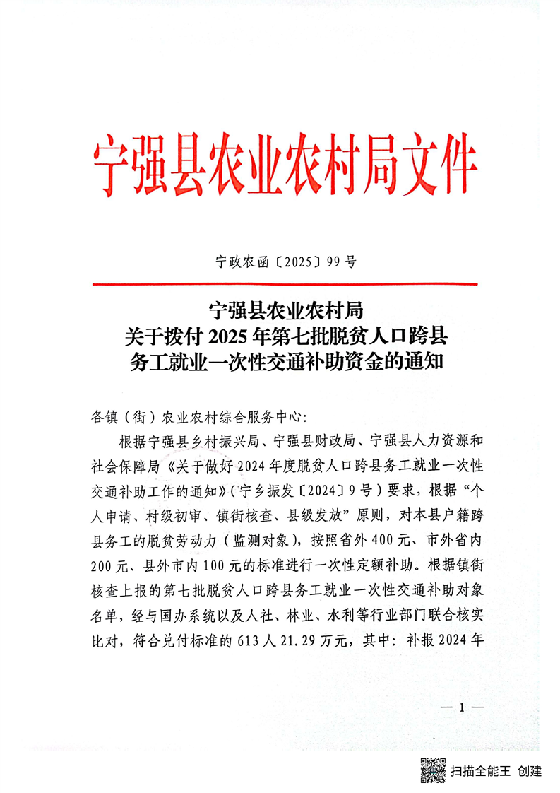 寧強縣農業農村局關于撥付2025年第七批脫貧人口跨縣務工就業一次性交通補助資金的通知