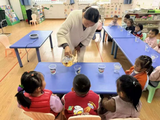 小班組幼兒圍繞傳統文化體驗展開活動,把自己做的菊花裝飾和菊花茶送給長輩,用稚嫩的聲音說“爺爺、奶奶節日快樂”,傳遞感恩心意。