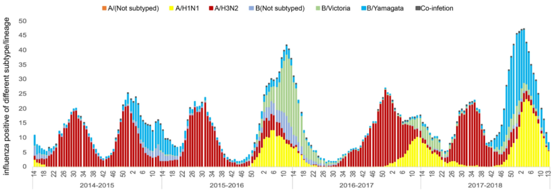 2014~2018年中國流感病毒陽性檢出率周分布情況