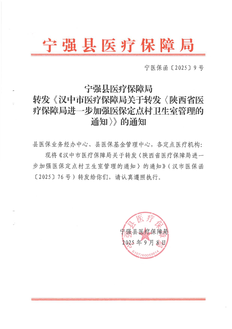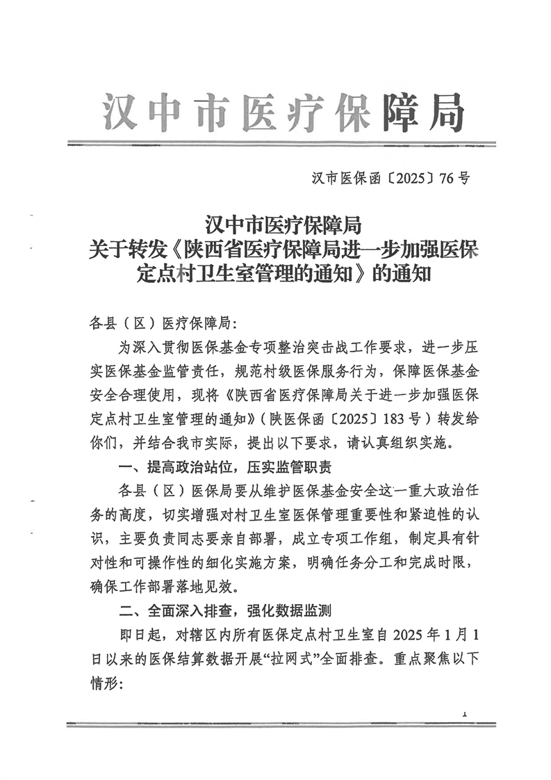 轉發《漢中市醫療保障局關于轉發〈陜西省醫療保障局進一步加強醫保定點村衛生室管理的通知〉》的通知