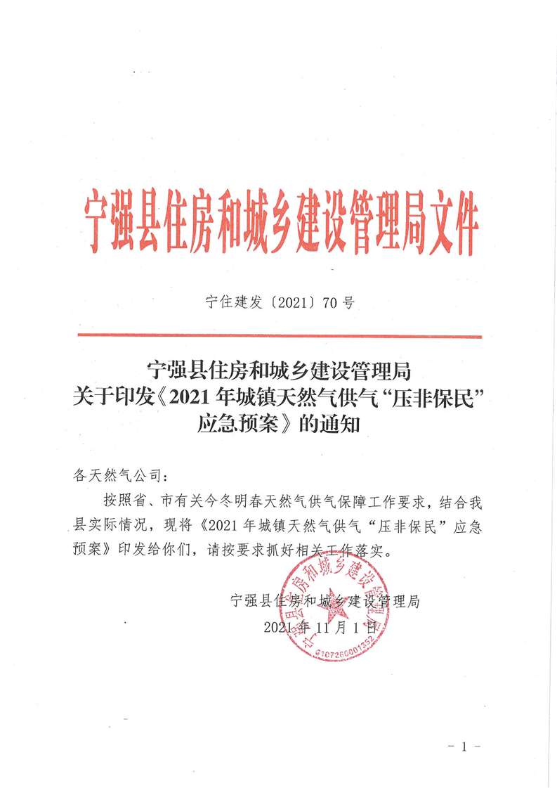 寧住建發〔2021〕70號關于印發2021年城鎮天然氣供氣“壓非保民”應急預案的通知