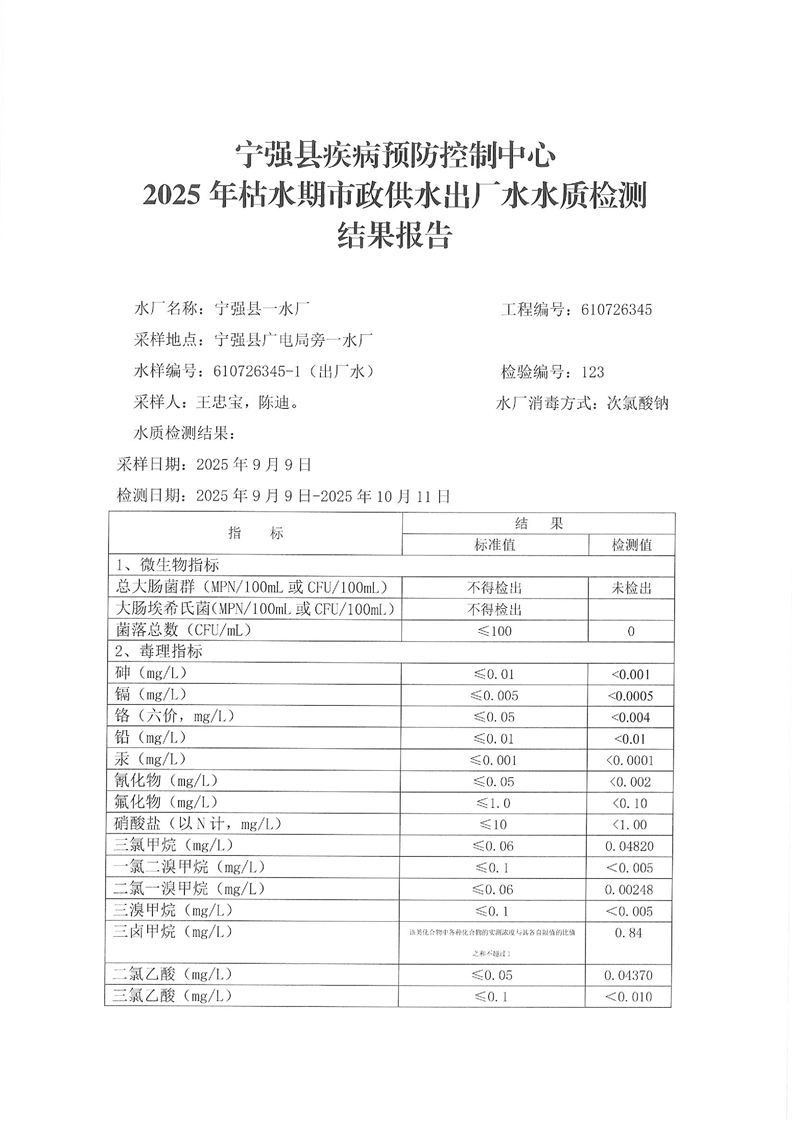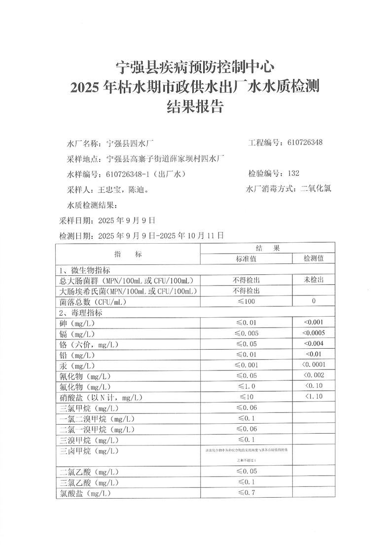 寧強縣疾病預防控制中心2025年枯水期市政供水出廠水水質檢測結果報告